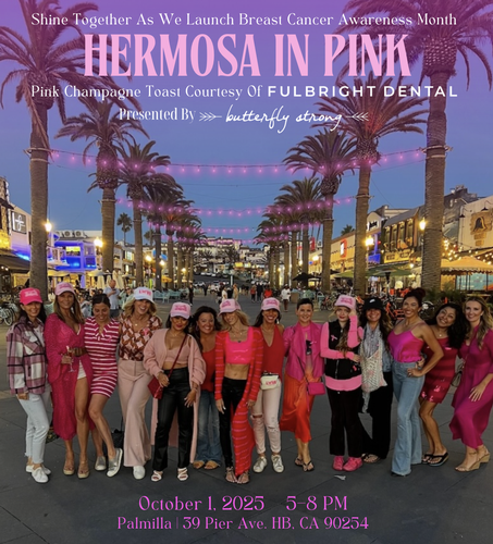 On October 1st, join us at Hermosa Beach Pier Plaza as we kick off Breast Cancer Awareness Month. Together with Malibu Dana, we’ll light the night pink, celebrate strength, honor survivors, and stand Butterfly Strong in the fight against breast cancer. Let the lights shine hope. Let the community stand united. Let’s turn Hermosa in Pink. Pink Champagne Toast Courtesy Of Fulbright Dental. Bubbly & Fanny Packs for the first 50 guests who purchase raffle tickets at the event. Group sunset photo at the pink-lit Pier Plaza.Wear pink!! 💖