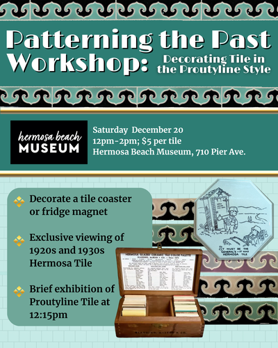 Join us at the Hermosa Beach Museum for a festive look back at world-renowned decorative tile from Hermosa dating to the 1920s and 1930s, then create your own work of art! At this workshop, you can be inspired by an exclusive look at beautiful tile samples from our collections to create your own masterpiece coaster or refrigerator magnet using a blank tile and art pens. Visitors will also have a chance to hear about T.C. Prouty’s Proutyline tile factory, which served as one of the earliest industries in Hermosa between 1922 and 1937.
