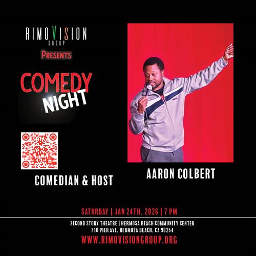 Laugh the night away with RimoVision Group’s Comedy Night on Saturday, January 24, 2026, at 7 PM at Second Story Theatre in Hermosa Beach.