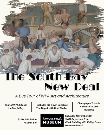 Join the Hermosa Beach Museum for a day of art, architecture, and local history as we uncover the South Bay’s hidden New Deal treasures. This guided bus tour visits more than fifteen WPA sites across Hermosa, Redondo, Torrance, and beyond—plus includes lunch at The Depot and a champagne toast at the Clark Building.